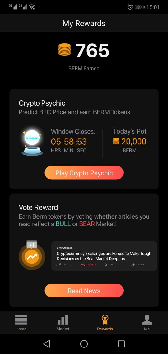 1- Features News, where user can read all the Important Crypto news. Doing that user can click on Bull or Bear to get 1 Berm. Maximum Berm can earn is 10 by reading news.