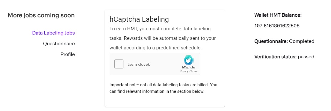 Earn money by completing tasks using the Human web app. Only the hCaptcha label is available to get you started. You click on the images, follow the instructions, and get rewarded with HMT tokens upon completion. The tokens are in the Polygon and Ethereum ecosystem, with rewards paid in real-time on Polygon.