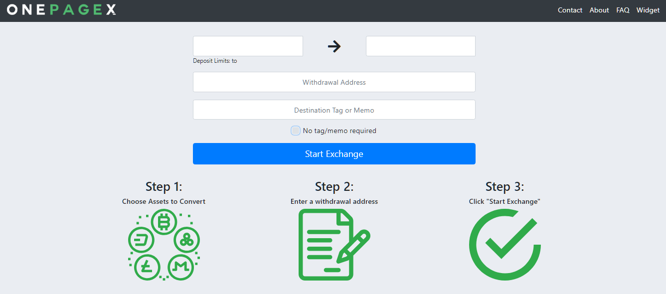 The knowing cryptocurrency exchangers today has one particulary thing: you have to do a full registration to do all the exchanges for every cryptocurrency, making this step a little bit difficult for some people but, there's an exchanger that makes this step more simple: OnePageX. This new cryptocurrency exchanger make's everyting more fast, clean and easy for every person who needs to exchange their cyptocurrency, this is why OnePageX is the best exchanger ever made, because you don't need a registration to exchange your tokens, How easy is this?!