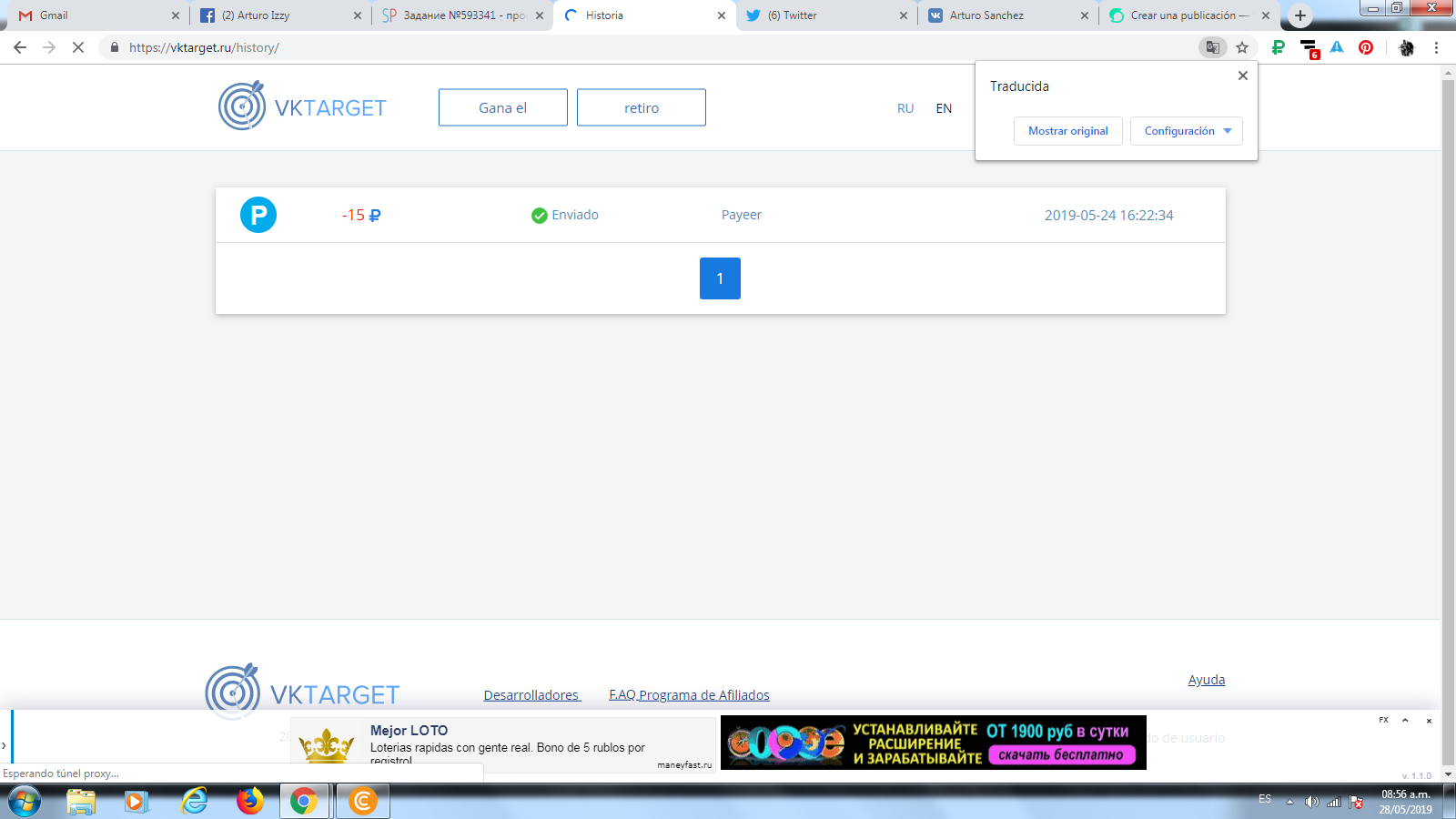 La pagina paga una vez ya tenga la cantidad de 15 rublos. Aquí tienen la muestra de pago