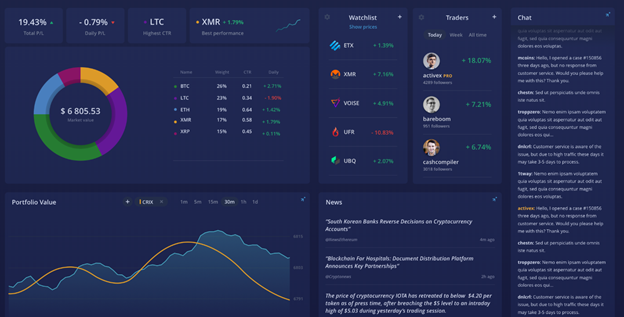 The dashboard is the overview of trading. The user can easily monitor portfolio value movements; it also has trading news where the user can check on what's happening in the market and a messaging function where the user can interact with other traders.