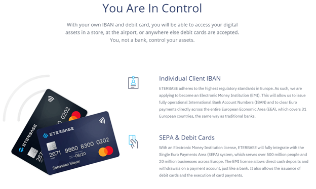 Another distinctive feature of Eterbase is the adaptation of traditional banking system through an International Bank Account Number (IBAN) that is widely recognized across Europe. Eterbase is in the move of applying for an Electronic Money Institution (EMI) license and is committed to going through regulatory compliance. Upon completion, Eterbase will provide services such as money transfer, debit cards, issuance of payment cards, issuance and acquisition of payment instruments, and cash deposit and withdrawal through the account. This will affect greater transparency and liquidity among clients.