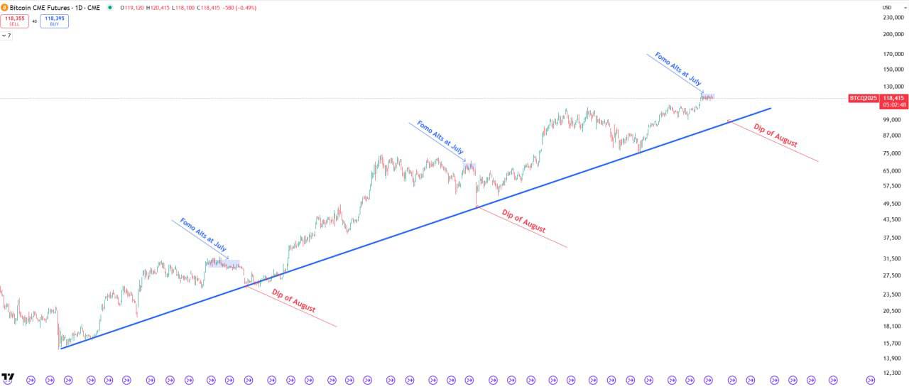 **Судя по статистике, каждый раз после локального **роста в июне - июле и фомо, **мы видели dip по альте в **августе **🙈, и это повторяется **3 года подряд