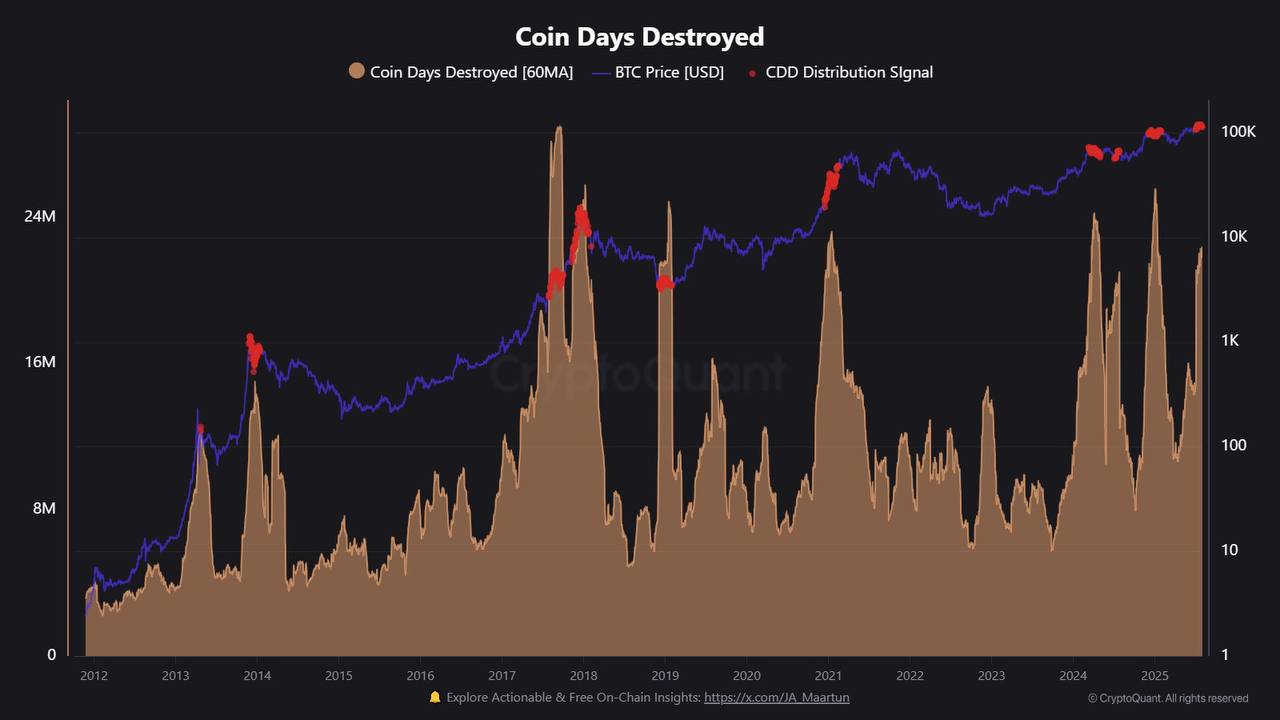 Встретили увлекательный индикатор — Coin Days Destroyed. Он отображает активность old-school кошельков, оставивших свои BTC в покое надолго.