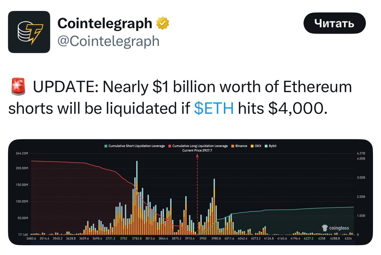 **Ну что вы готовы мощнейшему **Short squeeze? Как **только цена достигает **4000$, **будет ликвидировано порядка **1млрд шортов, так что **тряска имеет место быть, так как **закрытие шорта - это покупка по рынку **по сути, так что можем увидеть неплохую палку вверх 🆙
