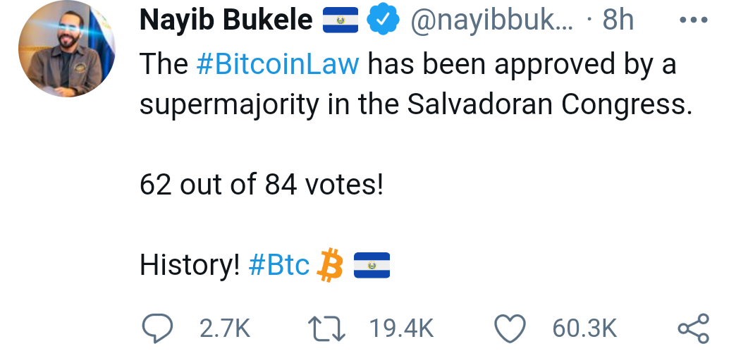 இந்நாட்டின் அதிபர் Nayib Bukele பிட்காயினை நாணயமாகப் பயன்படுத்துவது குறித்து நாடாளுமன்றத்தில் இதுகுறித்து அறிக்கை சமர்ப்பிக்க உள்ளதாக ஜூன் 5ஆம் தேதி அறிவித்தார். ஜூன் 9ஆம் தேதி இதற்காக ஒப்புதல் அளிக்கப்பட்டு உள்ளது குறிப்பிடத்தக்கது. அடுத்த 90 நாட்களில் பிட்காயினை அதிகாரப்பூர்வ நாணயமாக அறிவிக்கும் அரசு ஆணை வெளியிடப்படும் எனவும் கூறப்பட்டு உள்ளது.