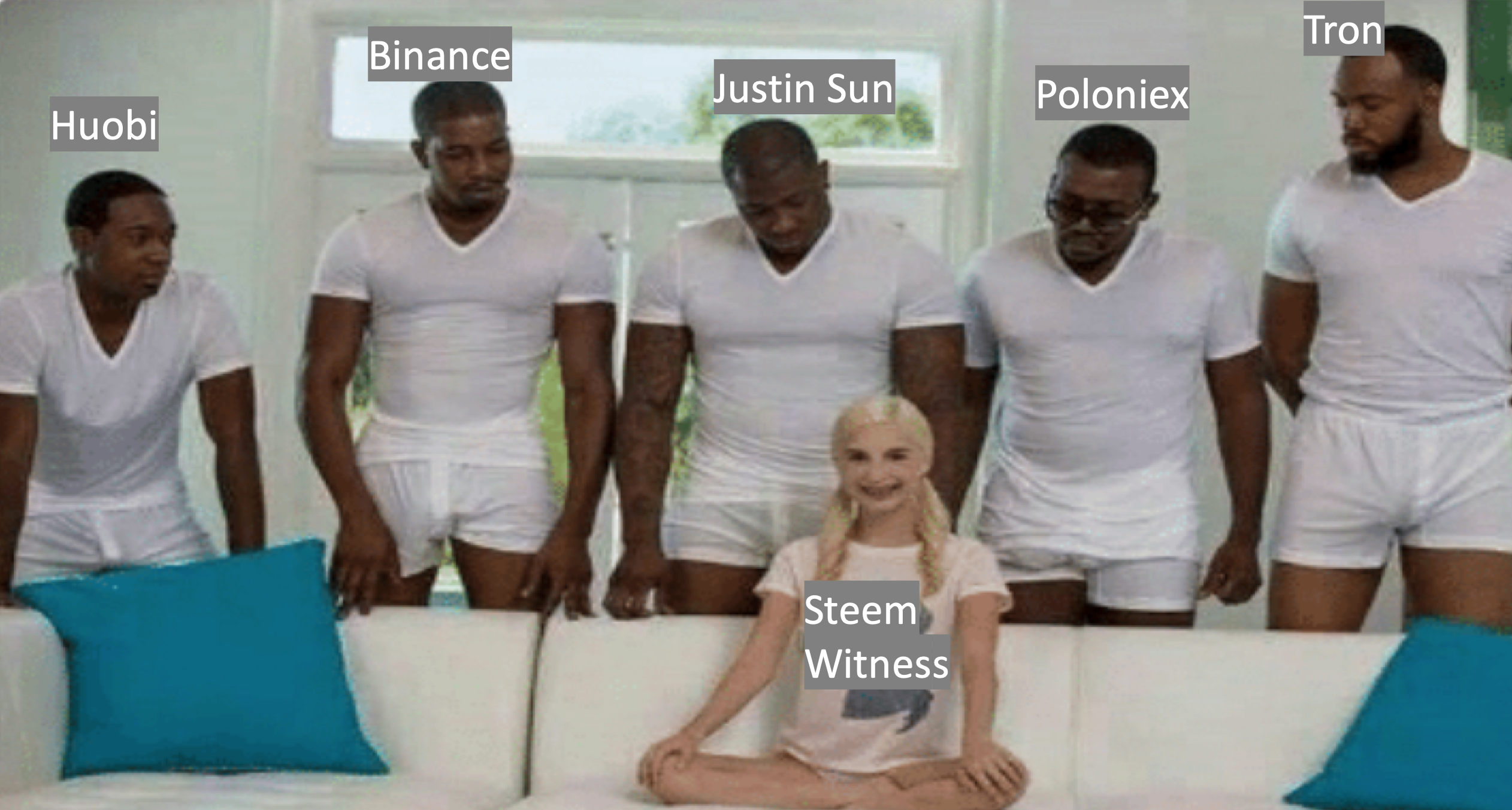 I think we all know what happened last night with some major exchanges powering up their Steem tokens to perform a hostile takeover of Steemit. See above photo I made just before things went down. Now I won't get into the soft fork because I find that a group of whales colluding to fork somebody out of an asset that they purchased totally wrong as well and now they are crying about it because there was recourse. What was everyone expecting?? The big dog to lie down and take one up the arse?? This was seriously underestimating their opposition. An opposition with an awful lot of friends in high places.