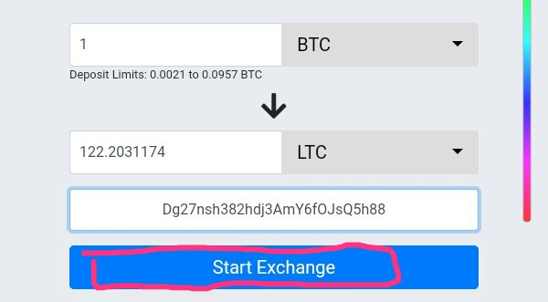After inputing the withdrawal wallet of the desired altcoin one wants to exchange, the next step which is as simple as all of the foregoing is to click the "start exchange" bar. From then, the transacrion is initiated and will be completed in a short while.