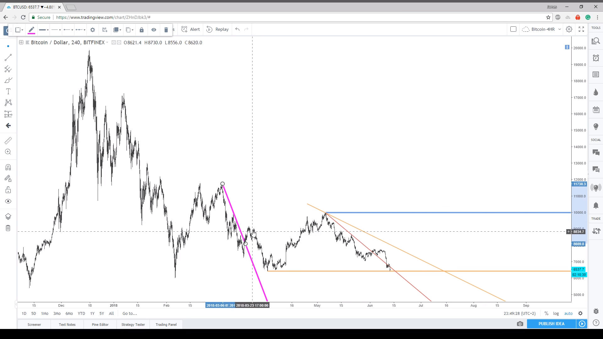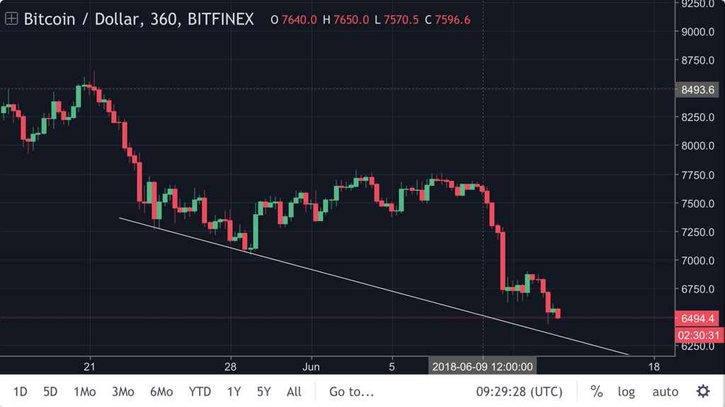BTC broke uptrend and downtrend line, showing the severity of the correction and the selling pressure. Last time we had this volume of selling (chart below - pink line) BTC broke through the downtrend with conviction. This was not the case this time around, indicating lower prices ahead. If we break the $6.4k expect $6k. Marshall does not believe $6k will hold. $6k is a very weak support.