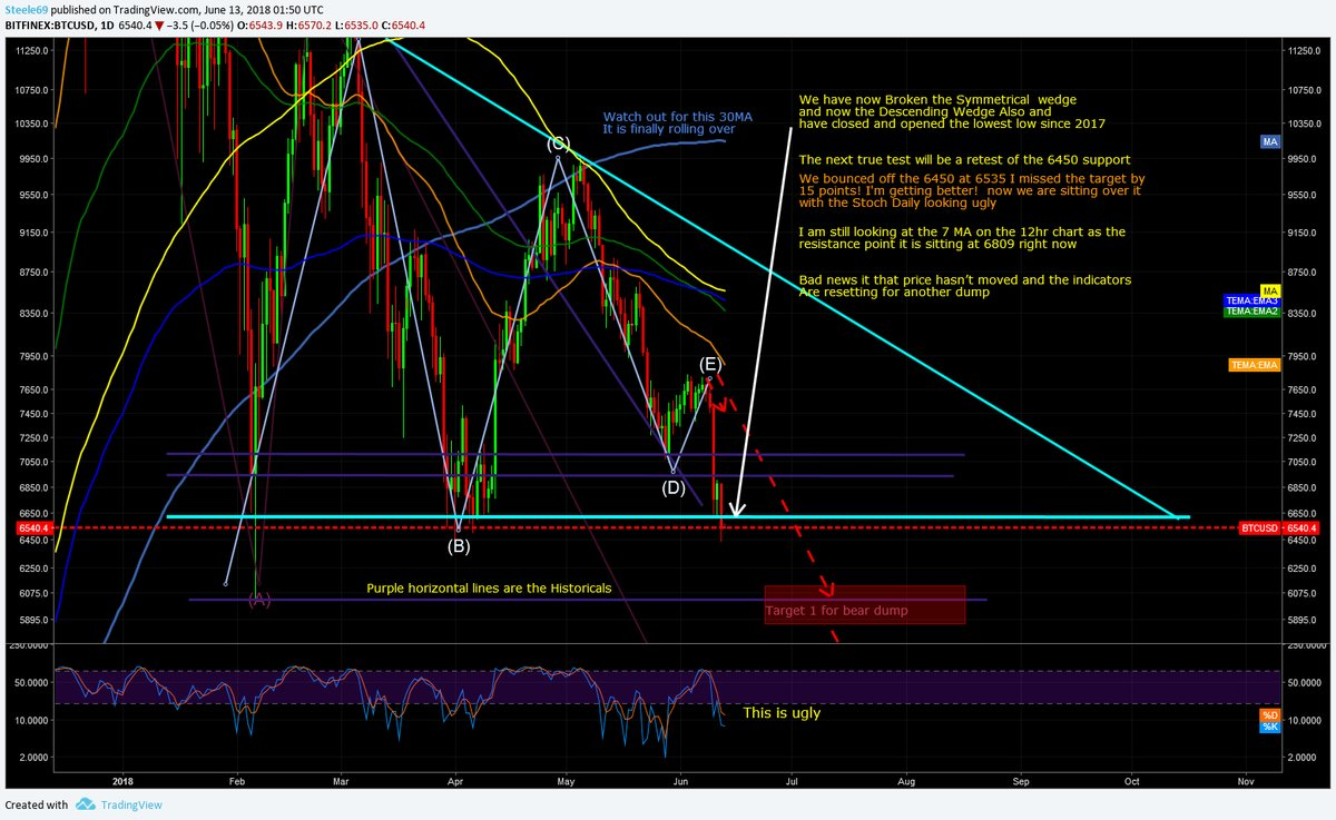 The lower support/trend line of the massive wedge broke as an immediate dump subsequently followed. He's surprised that BTC is back in the 6k range; He suggests adding possitions to the ALT COIN space, as many coins are very cheap with the recent down move in BTC. See chart for the next levels of support in BTC.