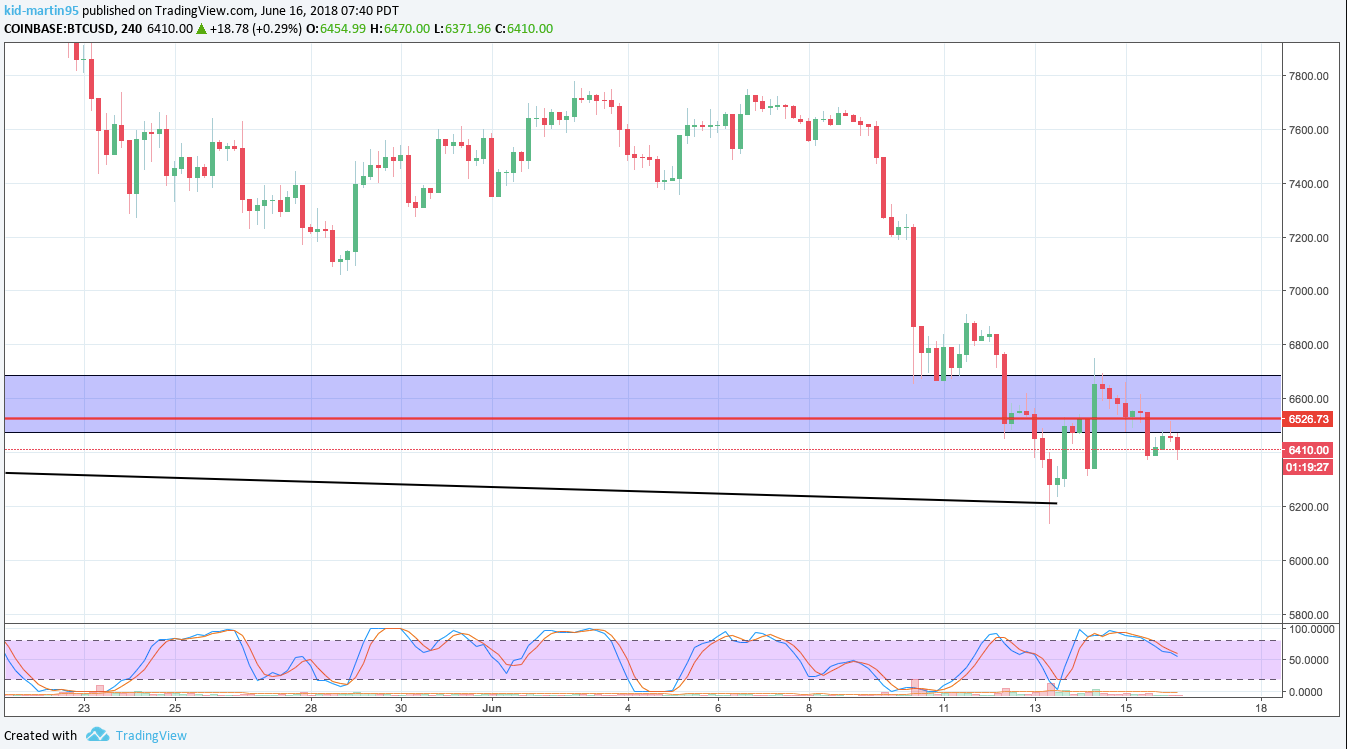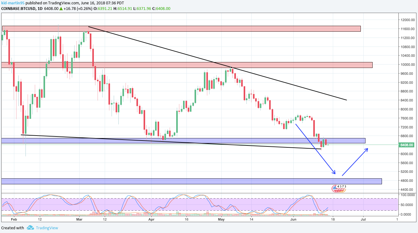 Shifting over to our pattern timeframe we see price has found minor resistance at $6,500 forming a lower high, price now looking to form a lower low. Stochastic RSI showing momentum is heading towards the downside, a 4hour close below $6,350 and we should see a drop towards $5,000.