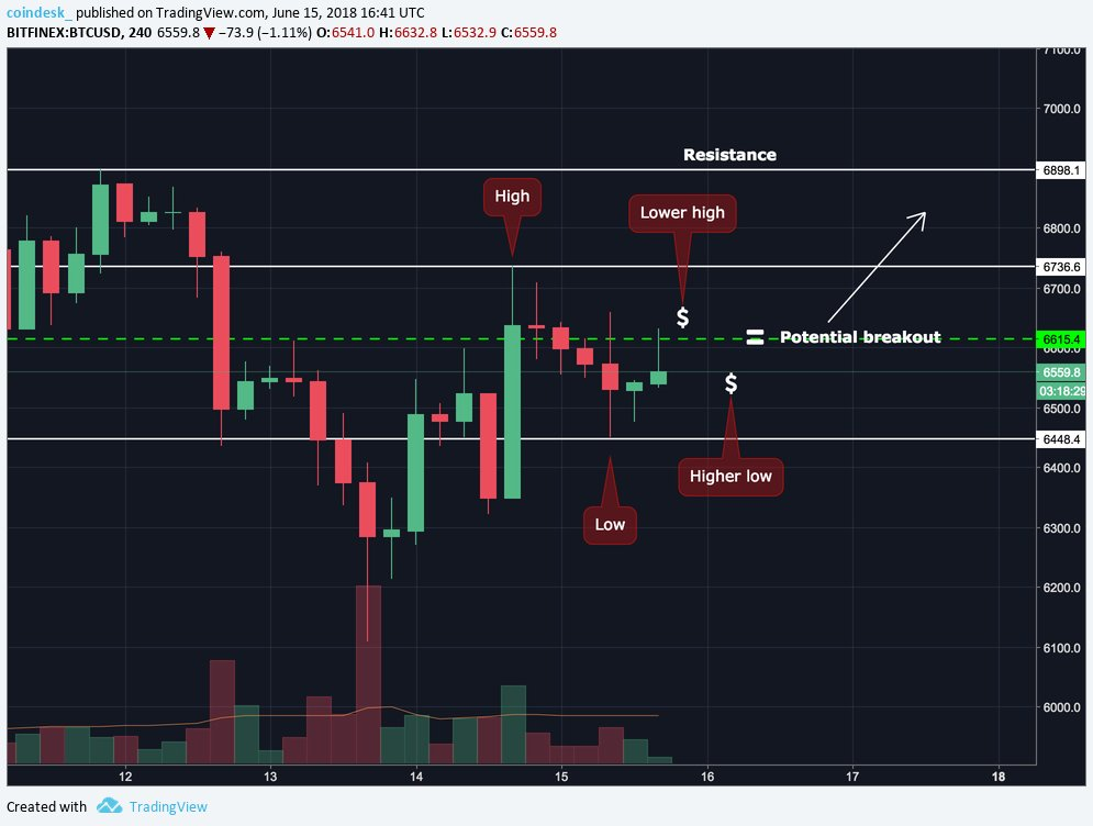 Here is a $BTC bull's perspective. A series of lower highs and higher lows followed by upwards price action is the anatomy of an equilibrium pattern breakout.