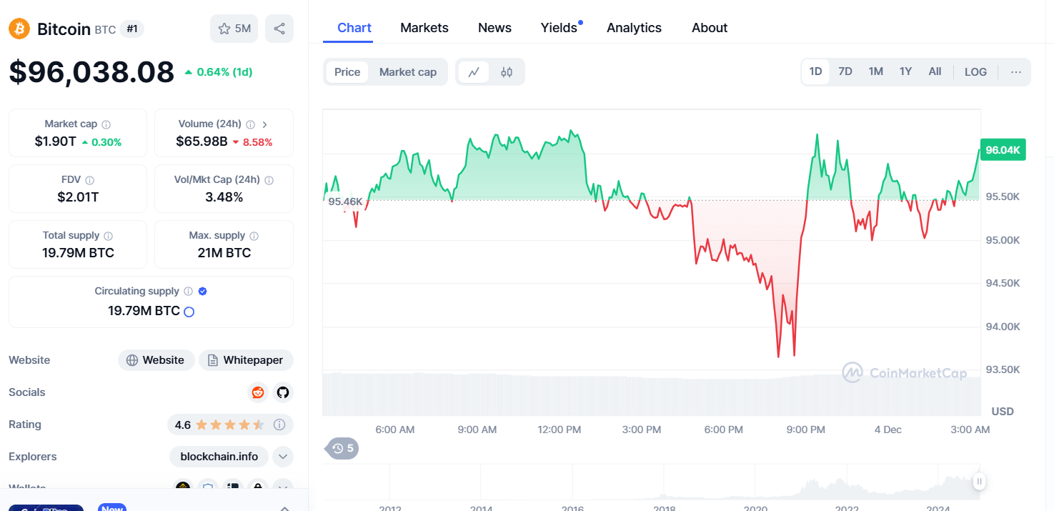 Bitcoin price today is $95,919.94 USD with a 24-hour trading volume of $65,975,992,918 USD. BTC to USD price in real-time. Bitcoin is up 0.30% in the last 24 hours. The current CoinMarketCap ranking is #1, with a live market cap of $1,898,310,017,476 USD. It has a circulating supply of 19,790,568 BTC coins and a max. supply of 21,000,000 BTC coins.