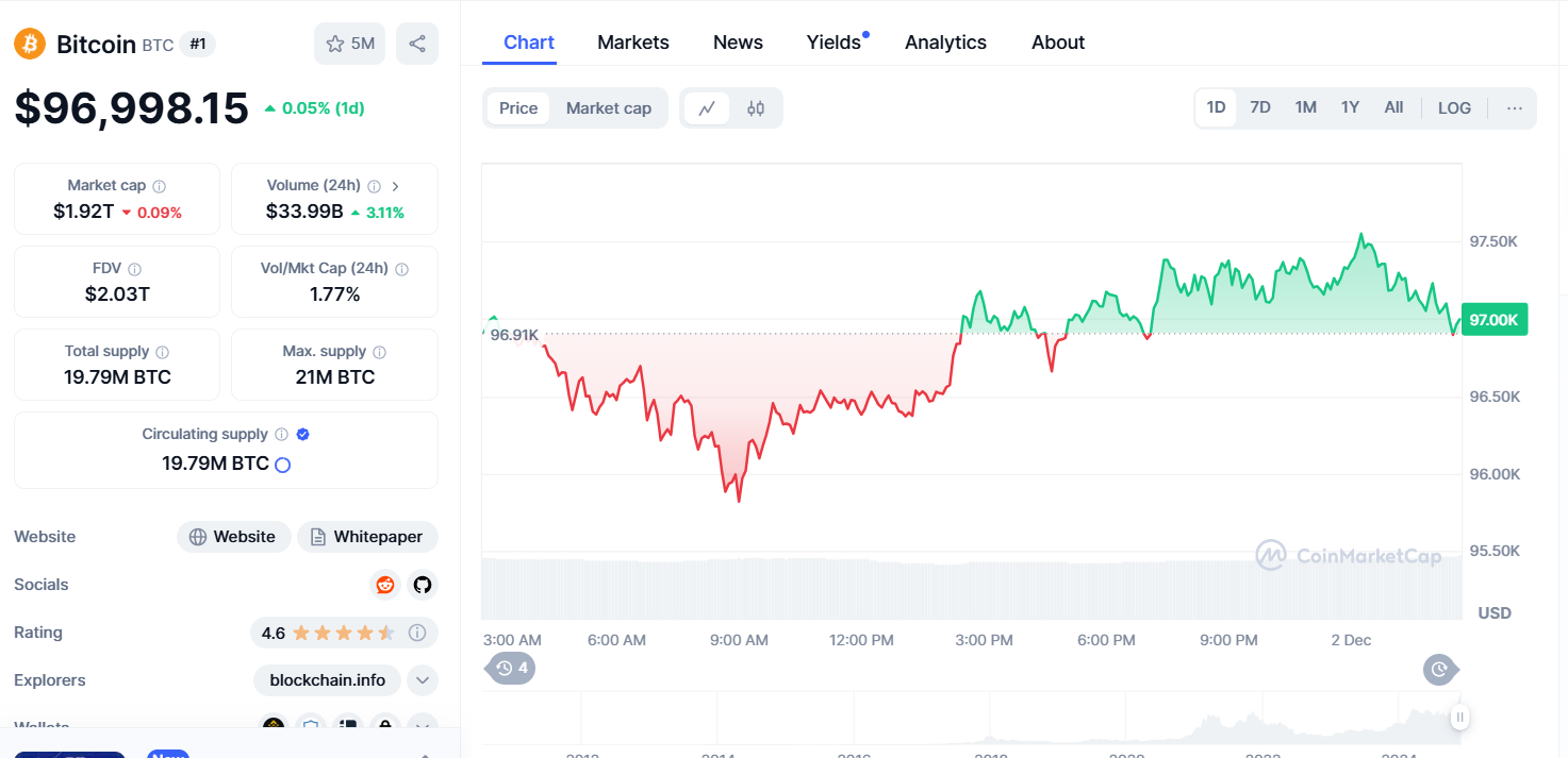 Bitcoin price today is $96,895.85 USD with a 24-hour trading volume of $33,988,153,546 USD. We update our BTC to USD price in real-time. Bitcoin is down 0.10% in the last 24 hours. The current CoinMarketCap ranking is 1, with a live market cap of $1,917,573,643,653 USD. It has a circulating supply of 19,790,050 BTC coins and a max. supply of 21,000,000 BTC coins.