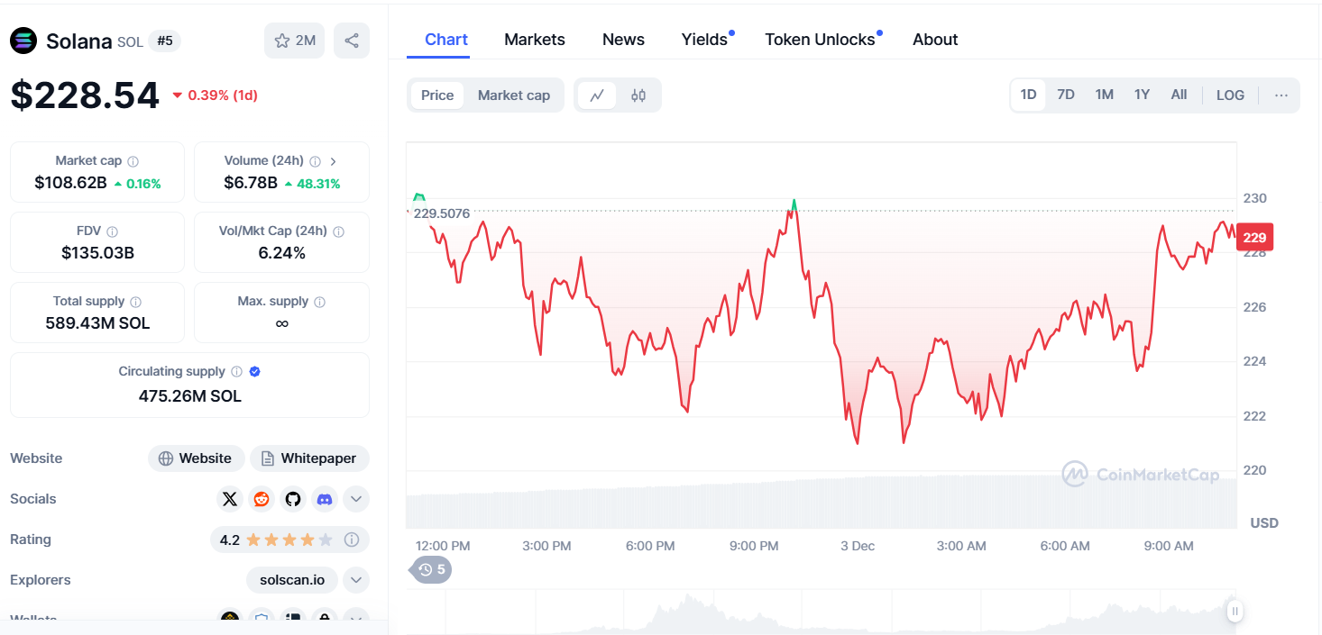 Solana price today is $229.09 USD with a 24-hour trading volume of $6,792,162,410 USD. We update our SOL to USD price in real-time. Solana is up 0.13% in the last 24 hours. The current CoinMarketCap ranking is #5, with a live market cap of $108,876,712,432 USD. It has a circulating supply of 475,261,666 SOL coins and the max. supply is not available.