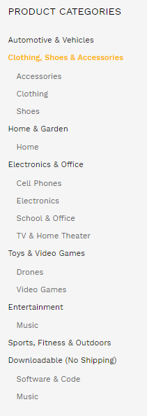 In the following screenshot you can see the categories of goods that can be purchased in this marketplace: