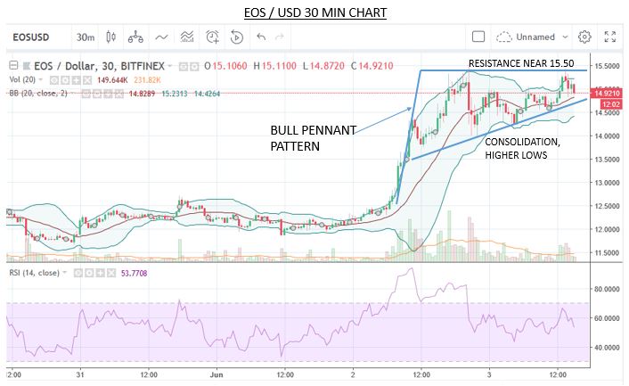 Since early on June 2nd, the price has spiked quickly from the 12's to the 14's and even above $15 at time and is putting in higher lows on the shorter time frame charts. There's a pretty clear bull pennant that's formed the past couple of days which I anticipate we will see a breakout from fairly soon as the lows are getting closer to that $15.40ish resistance level we saw on the daily chart that the price has a history with going back a few months.