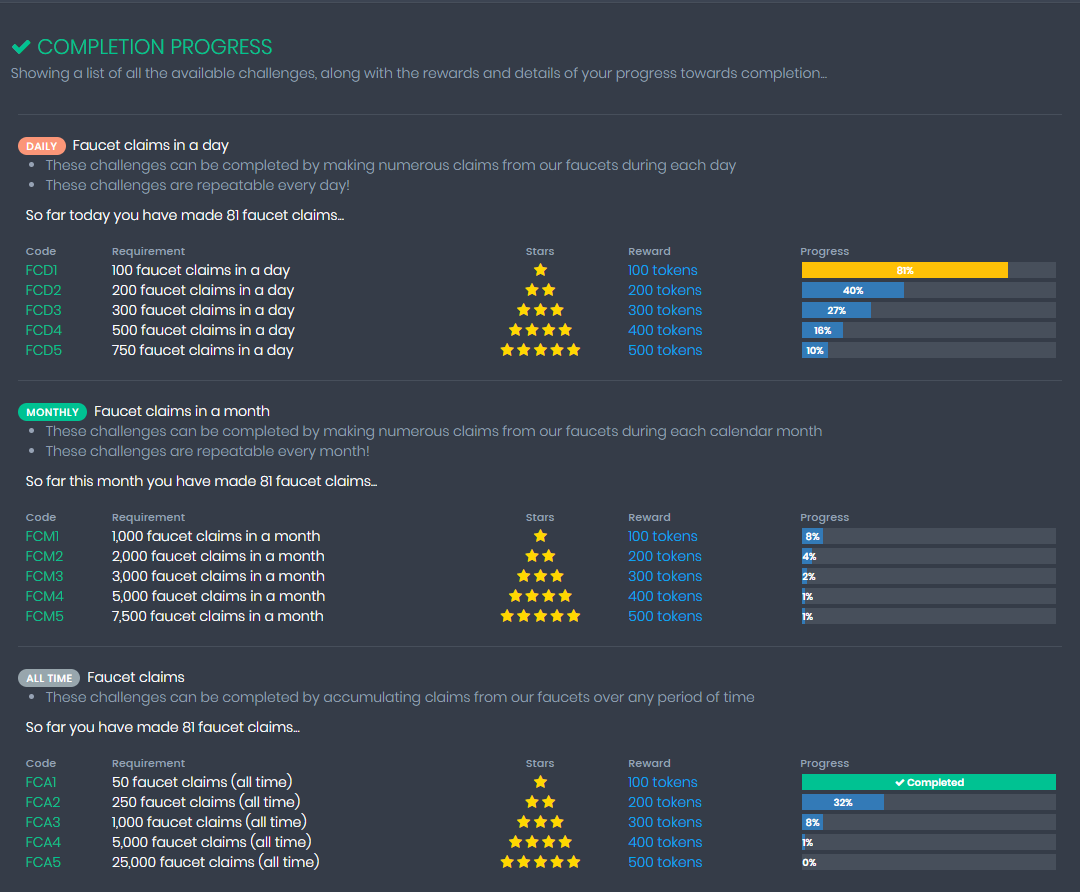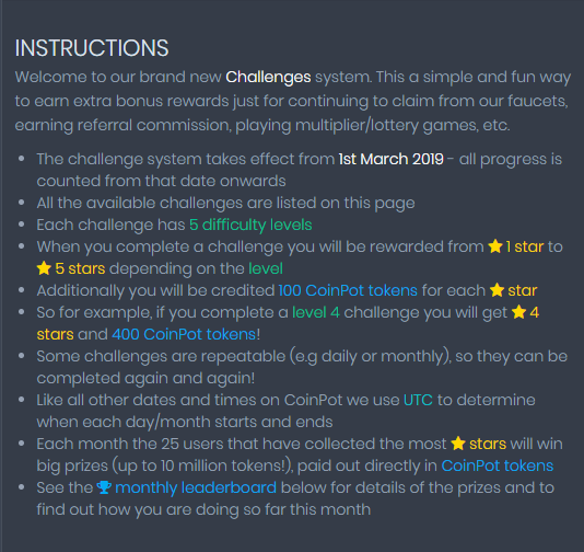 Now Coinpot has a new challange system where you earn to stay active with their faucet sites
