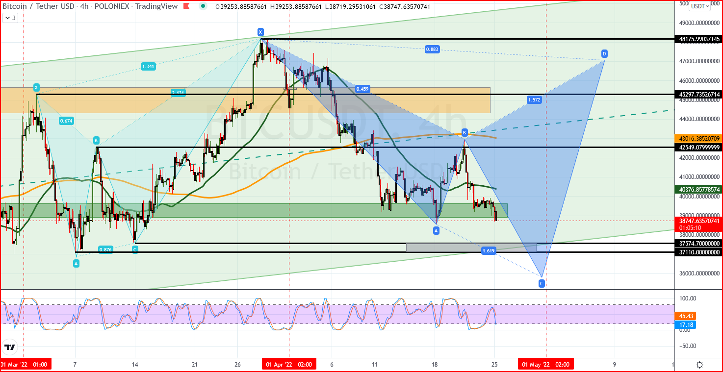 4 órás idősíkon, volt egy bizakodásra okot adó 39k környéki támasz zóna, ahova, a múlt hét első felében látható határozott emelkedés után, senki sem gondolta volna hogy ismét visszatérünk, sőt, ahogy a jelenlegi, azaz a hétfő hajnali történéseket látjuk, ebből akár csökkenő irányba ki is pottyanhatunk!