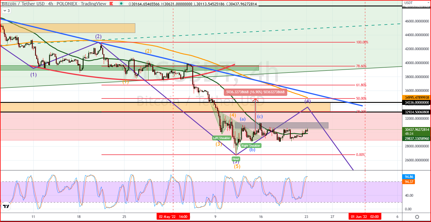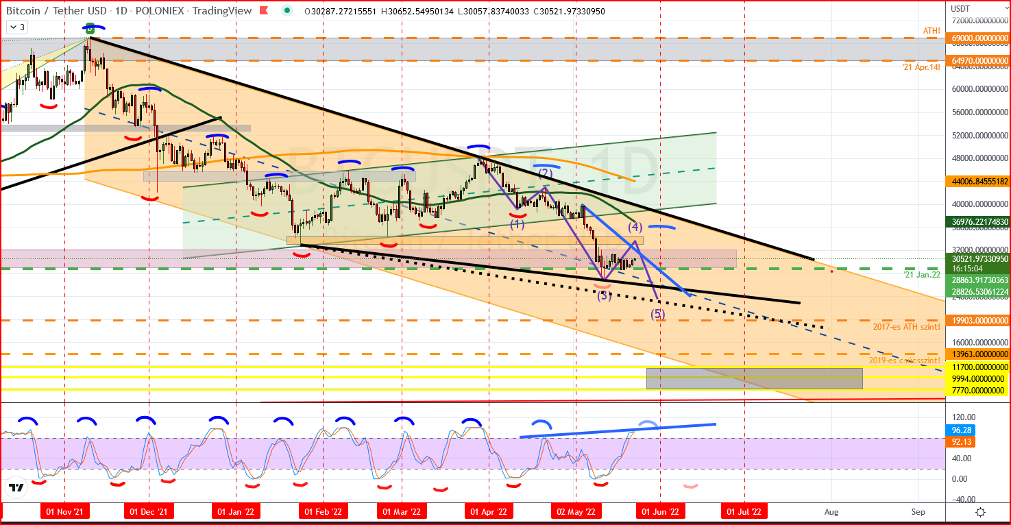 A napos idősíkra is felvázolt, lila csökkenő irányú Elliott hullámra alapozva, az ellenállási zónát is figyelembe véve, 33k magasságába vártam egy 4. korrekciós hullámot. Ami valószínűleg hibás hozzáállás volt, mivel, ha a lila hullámon egészen a célig szeretnénk lovagolni, akkor a 4. korrekciós hullám célszintjét, nagy valószínűséggel egy a 3. hullámom belüli ellenállási zónában kellene megtaláljuk! Tehát, ha voltak is 33k-s lehetőségeink, azok a sikertelen fej-váll lehetőséggel valószínűleg el is úsztak! Szürke színnel jelöltem azt az ellenállási zónát, amely fölött a lehetőségeink újra kivirágozhatnának, a folytatásban napos idősíkon erre is találhatunk indokot.