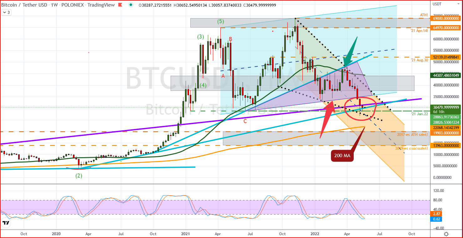 Hetes idősík már elég ahhoz, hogy a hosszabb távú lehetőségeinket pontosabban meghatározhassuk és ha már a múltban is a 200-as mozgóátlag érintése utáni hetek hozták a végső megoldást ('18 dec, '20 márc.), miért ne történhetne most is hasonlóképpen.