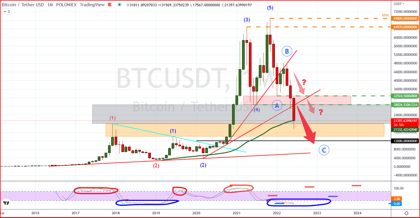 Jelen helyzetben megkérdőjelezhetetlen a csökkenő irányú trend és a felezőszint alatti mozgás! Sőt a szituáció fokozásaként egyelőre vissza-tesztre áll a mutató, ettől függetlenül semmi sem zárja ki annak a lehetőségét, hogy a felezőszinten átszaladjunk a fekete-kék ellenállásokig, durvább esetben a 27k környéki ellenállási zónáig.