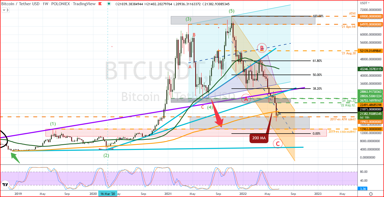 Szerintem csak akkor állta volna meg a helyét a 200-as mozgóátlagon történő átnézés, majd egy hasonló folytatás mint 2020 márciusában, ha a 2021 szeptemberi történések követték volna a piros nyilat és ezzel behúzunk egy durván 80%-os korrekciós visszanézést.
