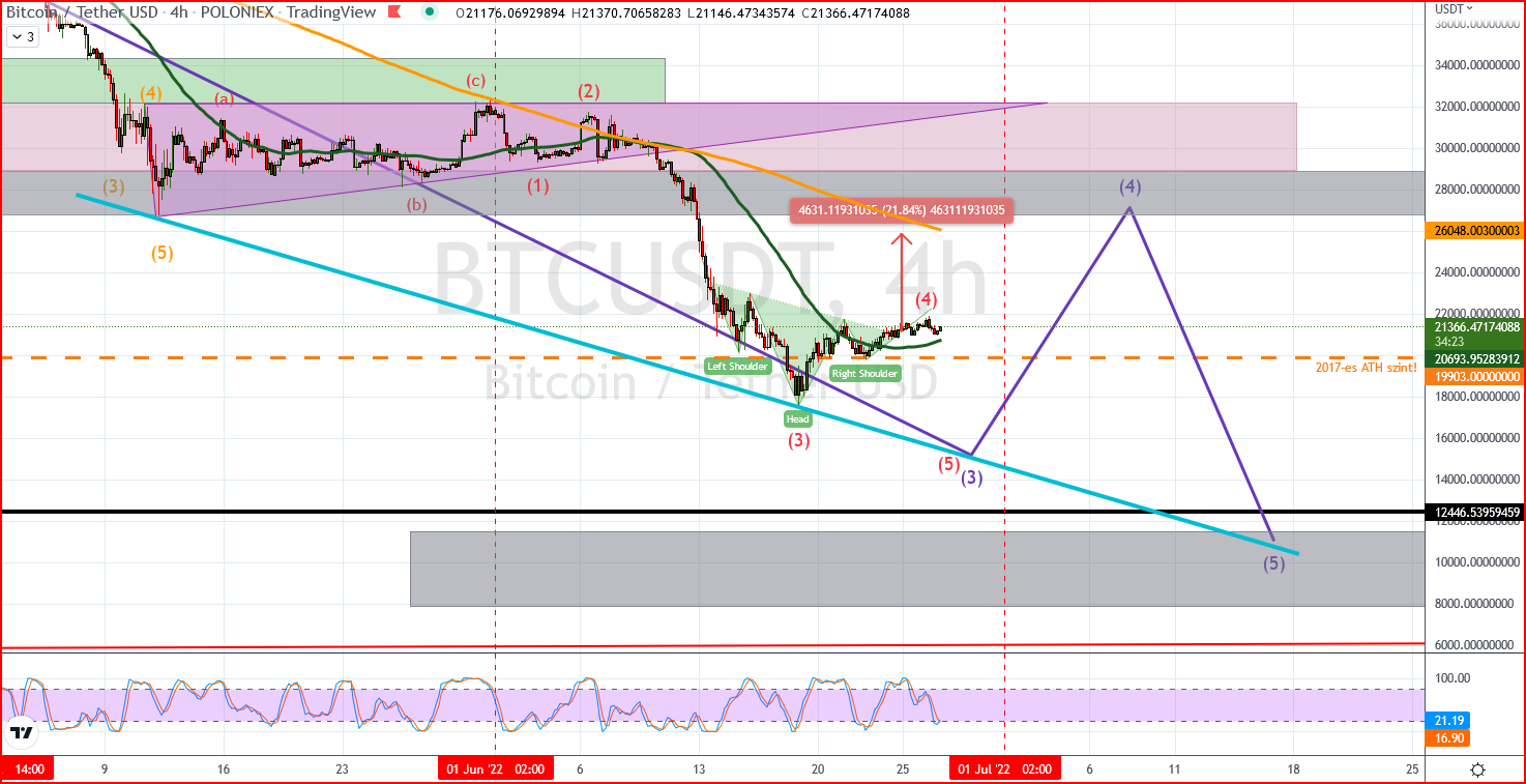 A zöld fej-váll szerkezet arra utál, hogy itt még egy durván 5k-s ugrással is szembenézhetünk. Ezt egy kicsit túlzónak találom, de, ha mégis ez fedi az igazságot, akkor a lila négyes hullámmal is feljebb kell majd gondolkodjunk, így még a 30k-s szintre beköszönés sem lenne egy váratlan húzás.