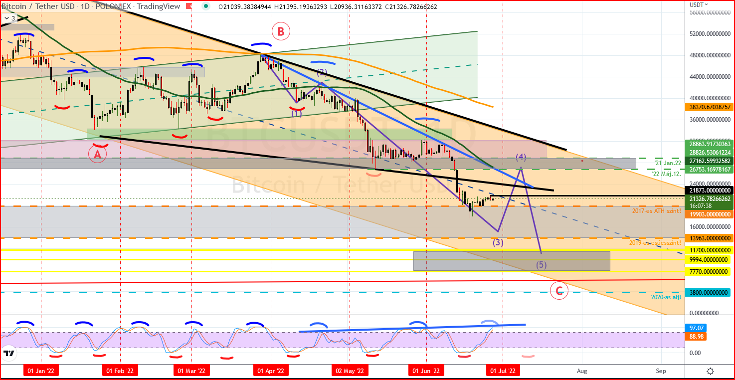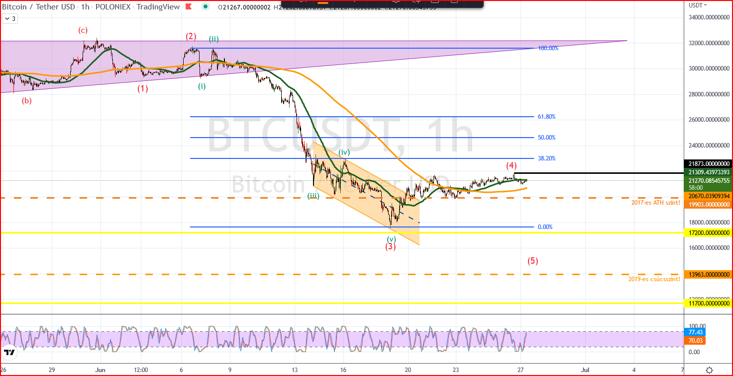 Az egy érdekes fejlemény lenne, ha a lila négyest, már a lila háromszögben lerendeztük volna, tehát a jelenlegi 17k-s aljunk és az ott megjelent fordított fej-váll rögtön magyarázatot is adna arra, miért is bukkant fel a 30k-s lehetőség! Sőt, mivel magunk alá gyűrnénk a 200-as mozgóátlagot, akár még arra is gondolhatnánk, hogy valami sokkal nagyobb dolognak a kezdőlépéseit láthattuk! Szerintem nem, de érdeklődéssel követjük a történéseket.