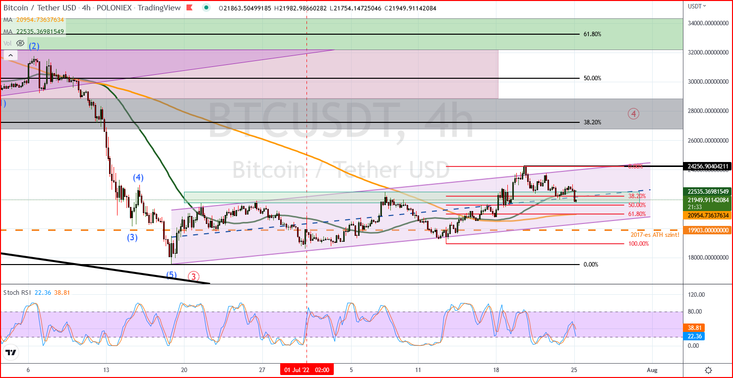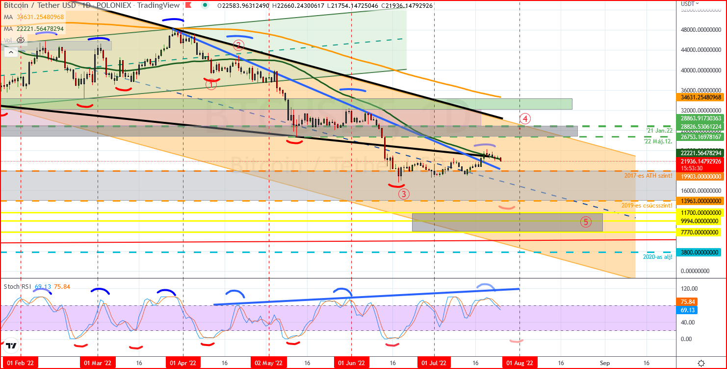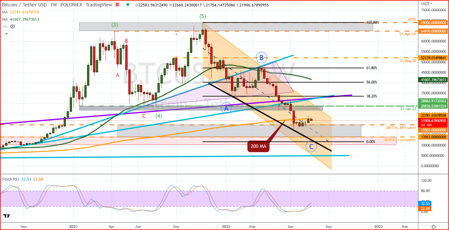 Hetes idősík: szép nagybetűkkel jelölöm azt az ABC korrekciót, amelynek végső momentumához közelítünk, legalábbis ebben reménykedünk! Ha van erő, akkor már június végén odatettük volna azt a visszarántást, amellyel betakartunk volna 17k-s szintre leszúró gyertyát és a szürke ellenállási zóna is rég megkaphatta volna már a vissza-tesztjét. Tehát ha már bő egy hónappal ezelőtt letisztázzuk a szándékainkat, akkor az esetlegesen bekövetkező negatív folytatásnak (amelyet végső történésként szeretnénk látni ebben a short trendben), tökéletes támasza lehetett volna a 2017-19-es csúcsszinteknek köszönhető szürke zónában! Helyette most van izgulni való(természetesen jó értelemben), elegek vagy sem a 12k környéki gondolatok, esetleg 10k alá is vissza kell nézzünk.
