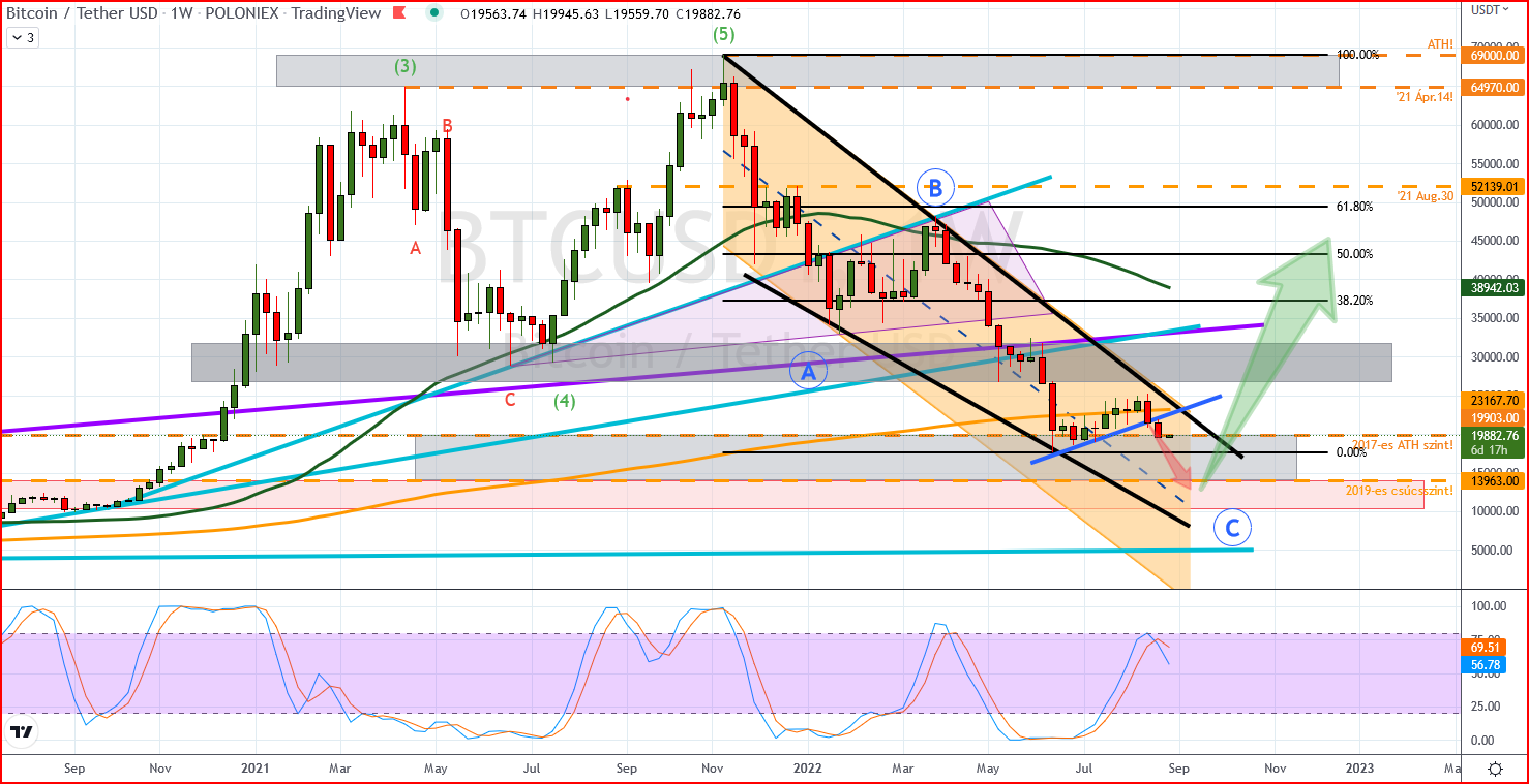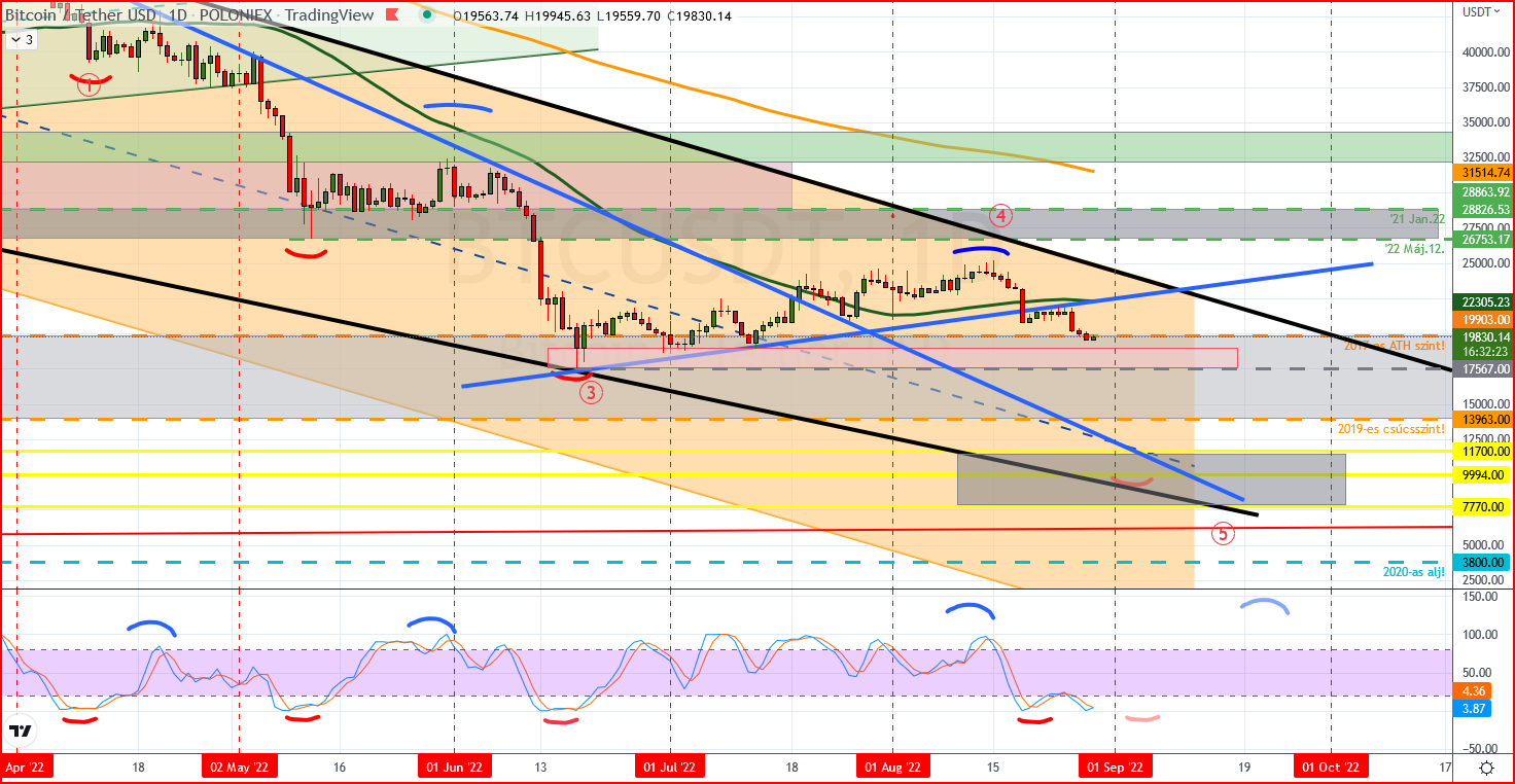 Ha jó az Elliott számozás és már csak az 5. hullámra várunk, illetve, ha azt is részleteire bontjuk, akkor a kék támasz alá szaladás, illetve abba kapaszkodás, lehetett az egyes-kettes hullám, tehát most egy intenzív hármas hullámnak kellene következnie! Ezt a gondolatmenetet folytatva és az egyes hullám méretét alapul véve, a várakozó intenzív hullámnak 12k környékére(a narancs csatornafelezőre) vagy legalább a 2019-es csúcsszint környékéig kellene visszanyomni az árat.