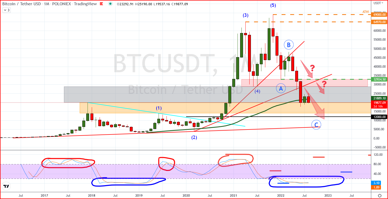 Hónapos idősík: "a kérdőjellel jelölt piros nyilak, még áprilisi-májusi óvatos elképzelések voltak, céljuk az volt hogy 20k környékén megtartható e az aljszint! Majd jött a júniusi gyertya és egy durvább piros nyilas jelölés, lehetséges 10k alatti aljszínt megjelöléssel, megcélozva a mindenkori long trendvonalat!