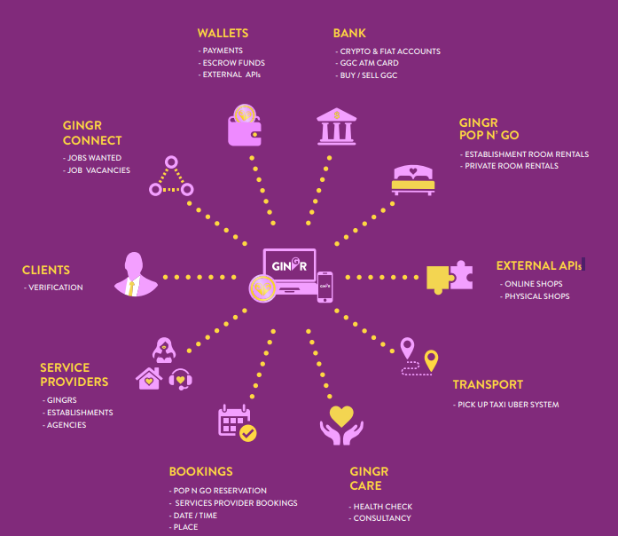 Gingr is a blockchain project that seeks to create a decentralized ecosystem for the sexual satisfaction industry and prostitution interface. By the use of smart contracts and mobile applications interface, individuals can book for prostitutes within their area and set times to meet with them.