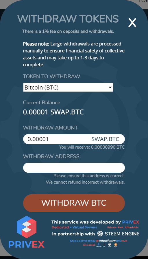 It costs 2% in fees, it's not instant, and it's limited by how much you have accessible to your hive-engine account, but it should work. I went through with the withdrawal and should receive 0.0000099 BTC soon. (At the time of posting this article, the payment hasn't arrived in my private wallet, but I will make an update once it does.)