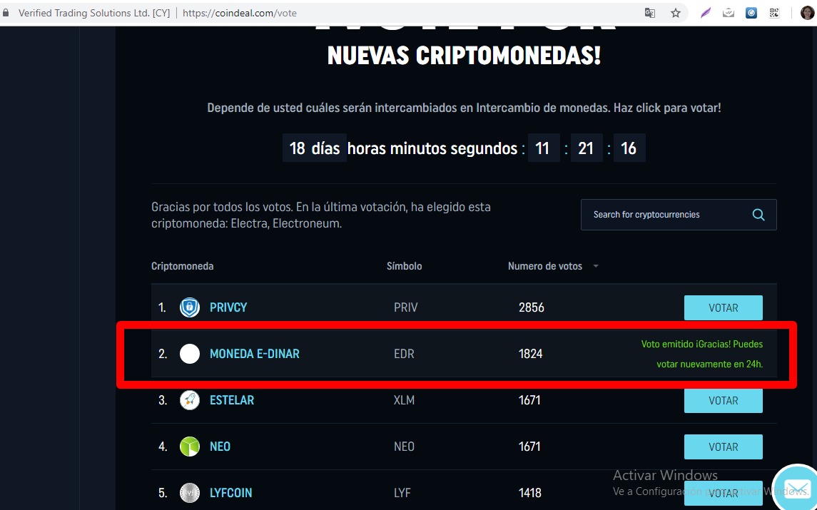 Despues de hacer todo esto y validar tu cuenta con un codigo que le llegara al correo debes de ir a la seccion de voto y buscas la moneda E-DinarCoin esta en estos momentos listado de segundo lugar le das click en votar y listo ya estarias apoyando a la comunidad puedes votar cada 24 horas.