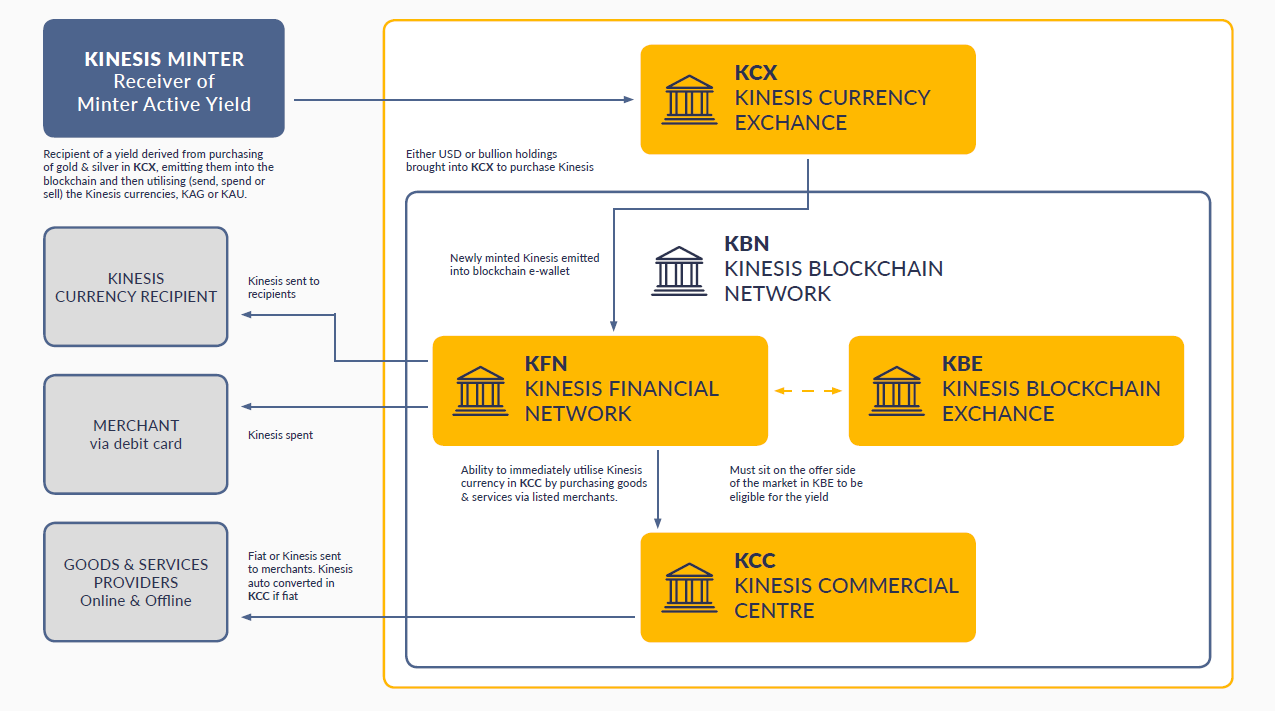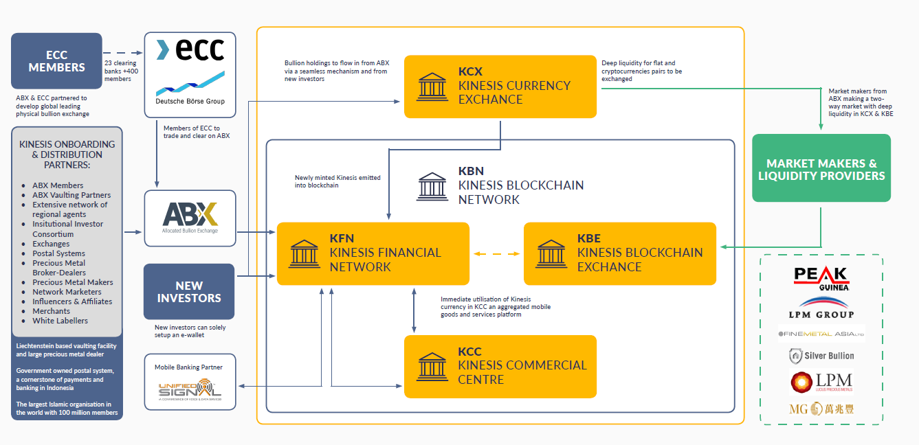 •Kinesis Currency Exchange (KCX): This is the wholesale market where the currency is minted and created. “This occurs in an institutional centrally cleared exchange with deep liquidity and connectivity into global wholesale trading organizations via Allocated Bullion Exchange (ABX).”