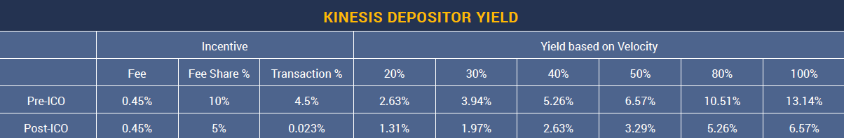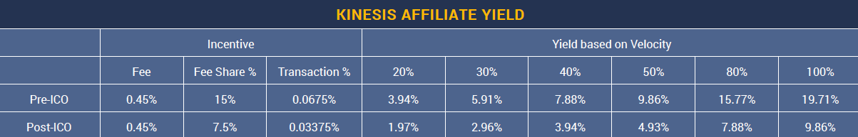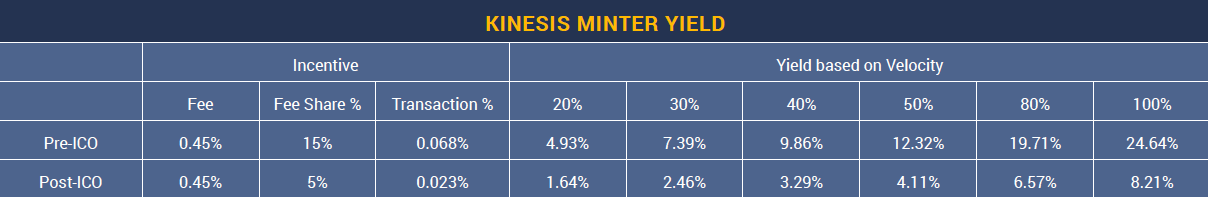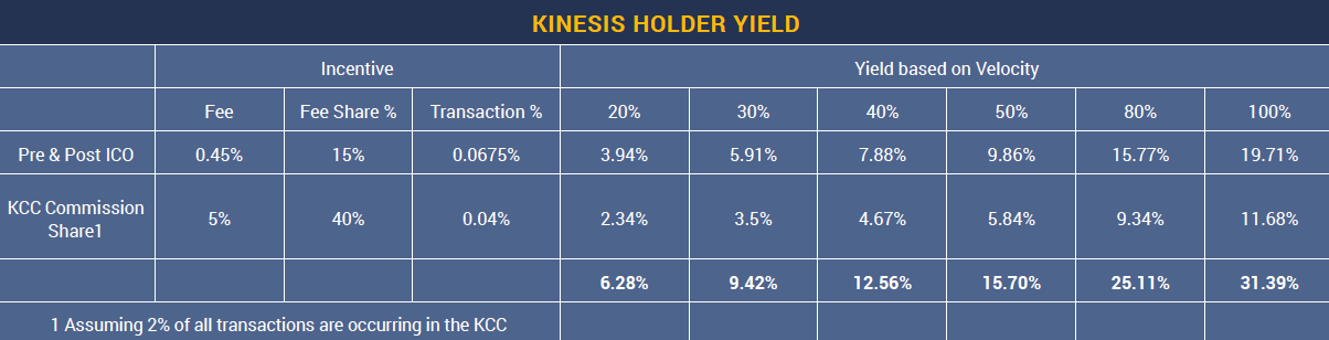 The Kinesis Velocity Token is an ERC20 utility token that receives a portion of the transaction fees from the Kinesis Monetary System. KVT holders receive a proportional 20% share of all transaction fees associated with all Kinesis currencies and a further incentive of 20% of all commissions from the Kinesis Commercial Centre(KCC).