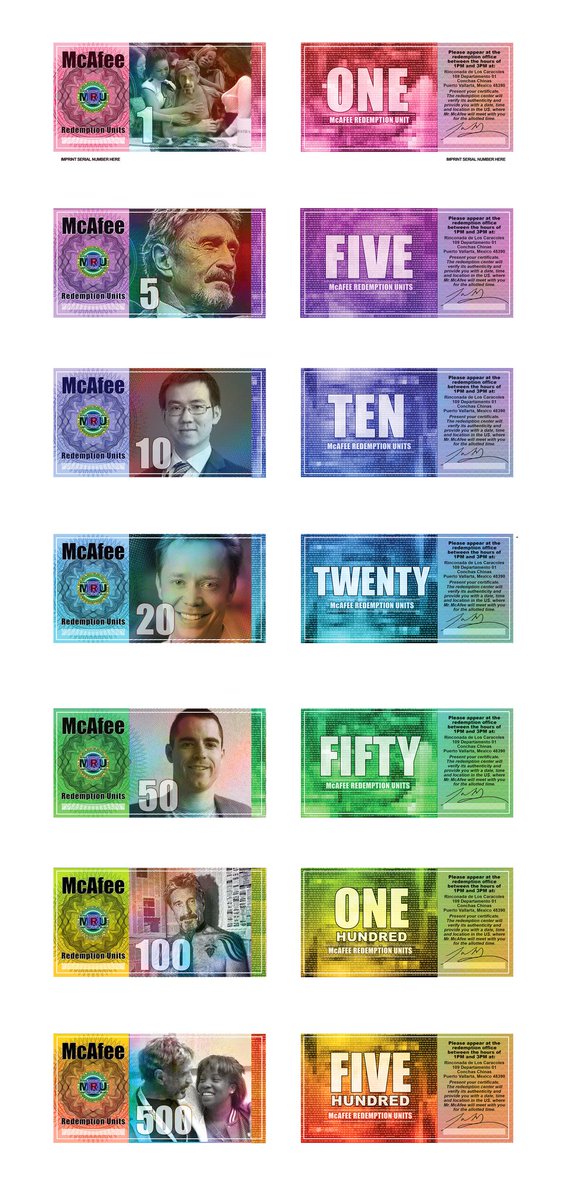 Initial Coin Offering (ICO) promoter John McAfee says he will be releasing a physical cryptocurrency by the name of “McAfee Redemption Unit” (MRU), which is distinct from ''McAfee Coin'' which launced some time last year. Thia has been confirmed by McAfee's official twitter. The actual notes come in 7 different denominations, starting from 1 to 500 MRUs.Mcafee is a bit of an unorthadox individual to say the least and Four of the bills show pictures of McAfee shirtless and in other poses.but the one note in which he's surrounded by multiple women,while his nose is covered in a white powder takes the cake. The other notes feature photos of the founder of bitmain Jihan Wu, entrepreneur Brock Pierce, and the owner of Bitcoin. Roger Ver. According to McAfee 341,000 MRU notes have been printed, with an implied market cap of $60.2 million.McAfee is now 72 years old and it is estimated to take him roughly 25 to 30 years to accomplish this task.To top it off the process of redeeming the currency is even more difficult due to a message printed on the notes that reads ,they can only be redeemed in person in Mexico during a two-hour window each day, at which time the owner will be given a particular date, time, and location in the United States in which he or she will be able to meet with McAfee. Individuals, incidentally, may only redeem 100 MRUs at a time. When asked why this process is so difficult McAfee had this to say. “Redemption is purposely made very expensive. My followers are hugely loyal and I feel certain that many will go through time and huge expense for the opportunity to spend private time with me. See what this might do to the fundamental value of each redemption unit. If the value of a unit is based even remotely on the cost of redemption, which people are willing to pay, then the notes will immediately skyrocket. But the big key is in the way I have structured the auction sites. Cannot tell you more now.”Many websites also have theories that this is an elaborate hoax. Hoax or the real deal? Comment your opinions below.