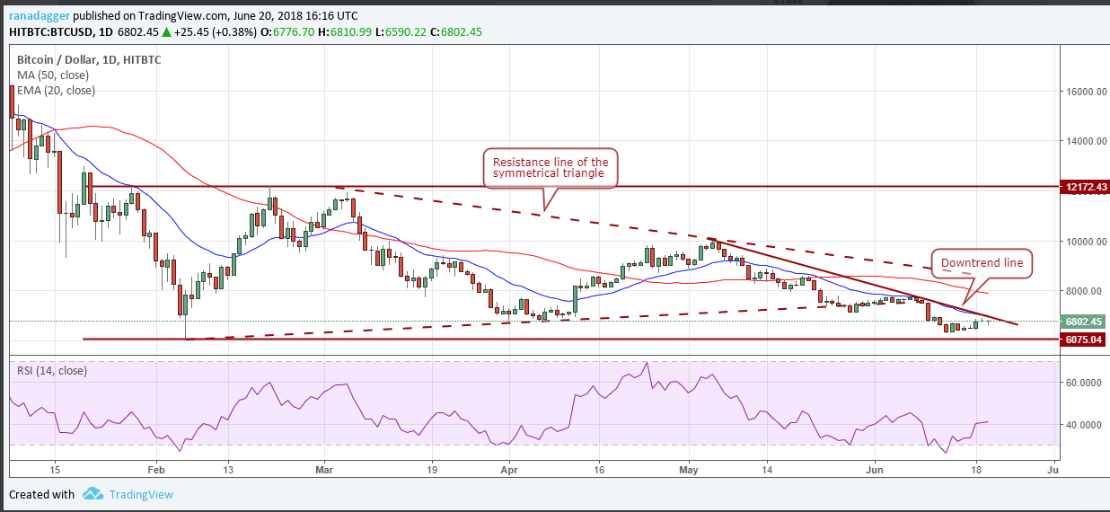 Bitcoin está tratando de alejarse de los mínimos. Tiene una gran resistencia en la línea de tendencia bajista. La EMA de 20 días también se encuentra justo arriba de esta línea en $ 7,011. Si los precios bajan debido a la resistencia del techo, es probable una nueva prueba de los mínimos del 13 de junio a $ 6,277.23.