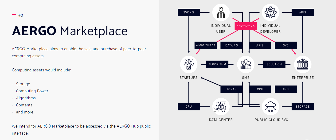 AERGO Marketplace — торговая площадка экосистемы. Она используется для продажи одноранговых активов, таких как вычислительные мощности, алгоритмы, объемы хранения данных.