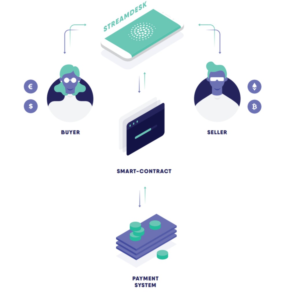 This is where the StreamDesk platform comes in. StreamDesk uses smart contracts to ensure safe P2P transactions, even with FIAT. The seller's cryptocurrency is blocked within a smart contract. As the fiat is transferred to the seller's account, the smart contract releases the cryptocurrency to the purchaser. The commissions are greatly reduced in comparison to traditional P2P purchase methods while safety is maximized.