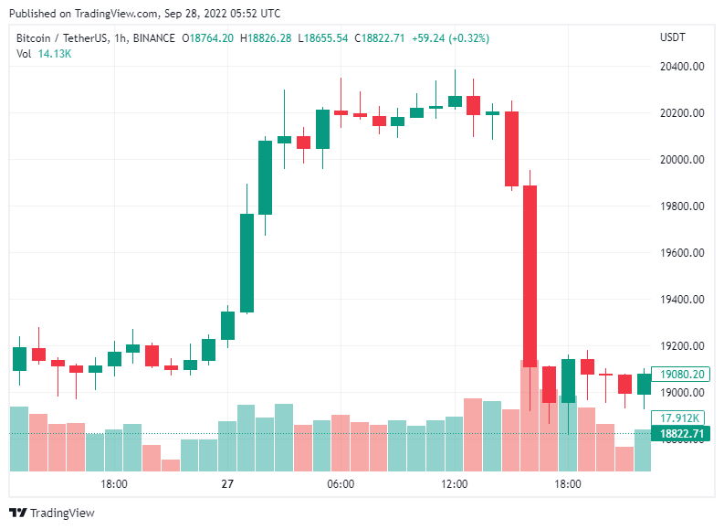 Support level is at $18,882 and resistance is at $19,080. While market volume is at $48,702,098,008.
