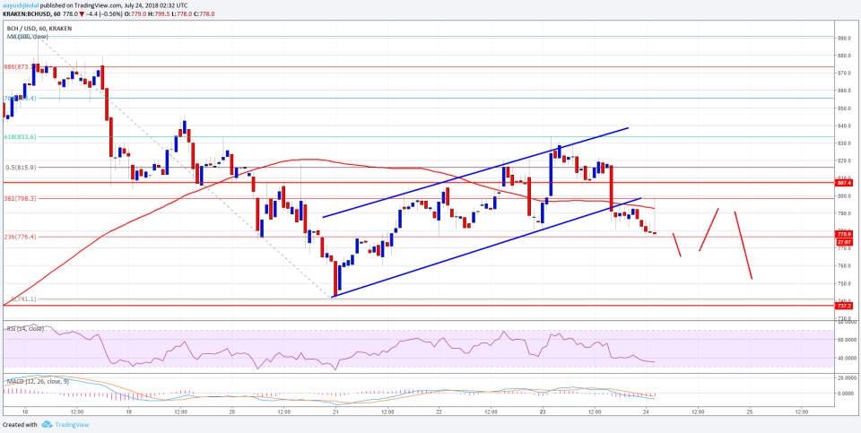 Bitcoin cash price is back below the $800 support against the US Dollar. BCH/USD is currently at a risk of more declines towards the $750 level.