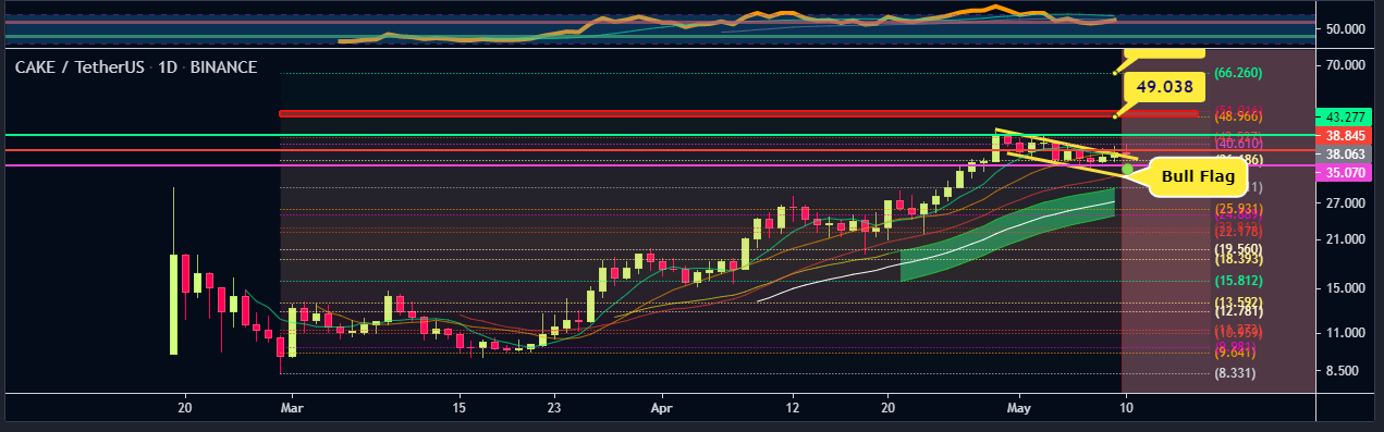 CAKE/USDT Potential Bull Flag ( Daily log chart). My profit Target is $50.