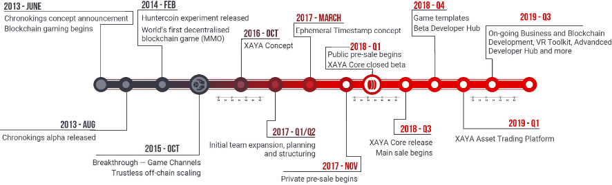 The following is a diagram of the work plan and the XAYA timeline, which is structured with the most important bookmark points for the project, in logical and direct phases of aggregates of tools, products and services for developers and players. ; with which it is expected to have a wider reach in the video game industry.