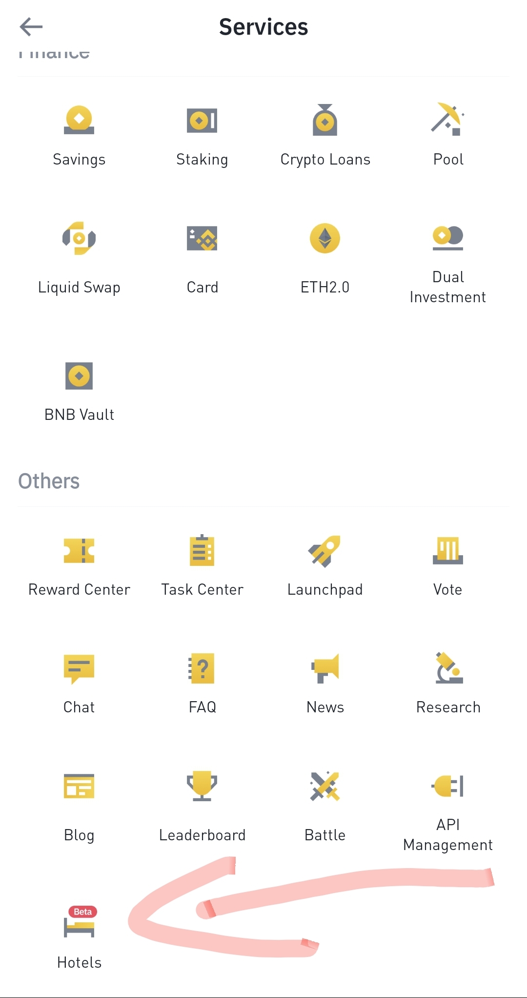 When you have the Binance App on your phone (I havent found it in the desktop version as yet), the in the 'more' option and you go aaaaaalllll the way down, then you see a Beta Logo for 'Hotels' and all of a sudden you end up in a sort of booking.com version on crack powered by crypto.