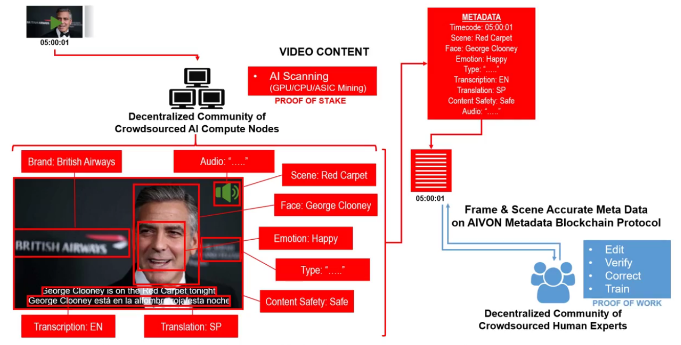 AIVON is a decentralized blockchain platform and protocol built on the network artificial intelligence (AI) and a community of human experts who work together to create normalized and sophisticated metadata for video content .A special AI algorithm will be used at the mine site, so that miner processor and graphics processor resources can be used to scan media files, resulting in advanced metadata, including time stamps, classifications, categories, transcripts and translations, and video object indexes.