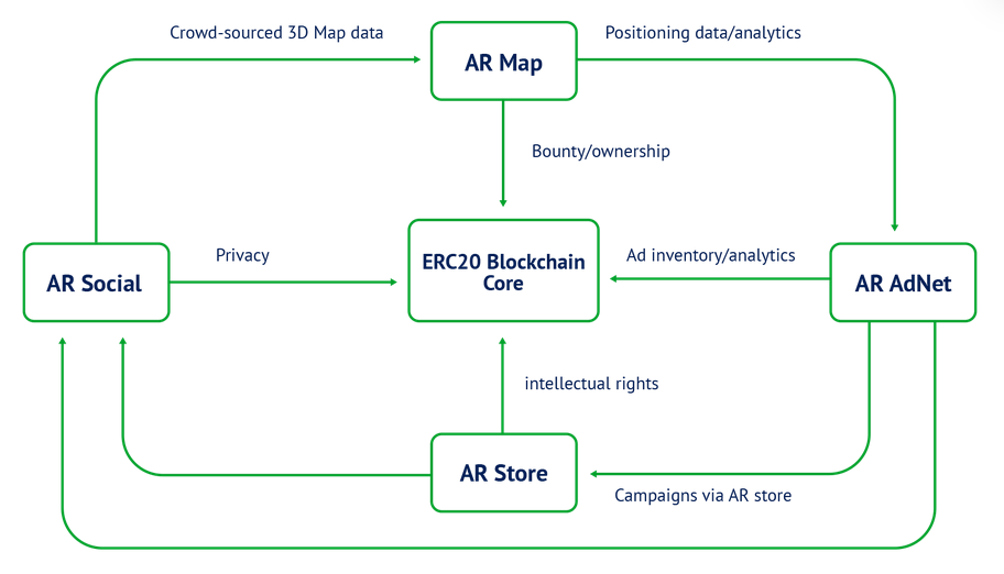 ARROUND Ekosistem terdiri dari empat komponen utama; jaringan periklanan universal, jejaring sosial, pasar augmented reality dan peta sistem AR, yang akan berfungsi sebagai basis sistem AR. Platform akan menciptakan karakter token sendiri sebagai ARR untuk memfasilitasi transaksi di jaringan. Tidak seperti virtual reality (VR), di mana semuanya virtual, mereka akan bekerja pada realitas yang diperluas, di mana lingkungan nyata digunakan, dan informasi akan ditumpangkan di atasnya. Realitas virtual sepenuhnya menggantikan sistem dunia nyata di mana Anda memiliki helm asli, dan tinggal di ruang khusus, sementara dalam realitas yang diperluas Anda dapat memeriksa di mana Anda berada di dunia.
