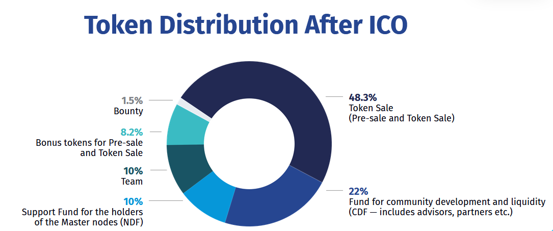 Token dibagi untuk beberapa tujuan. 48,3% token akan tersedia untuk dijual selama pra-penjualan dan penjualan token, 22% akan digunakan untuk Dana Pengembangan Komunitas, 10% akan digunakan untuk Dana Pengembangan Jaringan, 10% lainnya akan didistribusikan ke tim, 8.2 % akan digunakan sebagai bonus selama pra-penjualan dan penjualan token, dan 1,5% akan digunakan untuk karunia. Token yang tidak terjual akan dibakar.Alokasi Dana