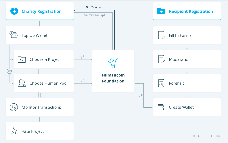 Humancoin offers a platform just for these purposes. Having certain advantages in comparison with traditional charities, and in the conditions of the development of the crypto-currency market, it can give a new impetus to the development of charity in our world. The operation process of the platform is quite simple and clear. Using smart contracts and advantage of the blockchain technology with a new growing financial market, the platform plans to raise funds for donations, simultaneously stimulating donations by the various privileges from the stores and services.